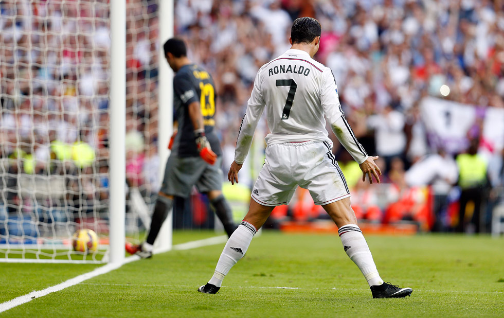 El caso es que al Real Madrid le tocaba remontar el encuentro. En un partido de este nivel eso podría suponer un problema para cualquier equipo. Pero gracias a Casillas, al presidente que le mantiene y al entrenador que le pone, es algo a lo que el Madrid y sus aficionados ya están acostumbrados. No problemo. El Madrid siguió con la hoja de ruta prevista y cargó contra la portería defendida por Bravo, portero imbatido en Liga hasta el día de hoy gracias a la mediocridad de los rivales que los culos han tenido enfrente. Después de un par de escaramuzas en las que el Barçurona podría habernos metido un susto serio en el cuerpo pero que sólo eran anécdotas en lo que se había convertido en un acoso total del Real Madrid, el colegiado señaló el punto de penalti gracias a la acción protagonizada por Chakiro Piqué, jugador en franca decadencia que tuvo a bien sacar la "mano del muerto" ante un centro raso de Marcelo quien, por cierto, firmó un más que decente partido si no se tiene en cuenta que su misión también consiste en defender. El caso es que Cristiano tuvo el honor de convertirse en el primer verdugo del tal Bravo en el presente campeonato de Liga. Enhorabuena, que caigan más.